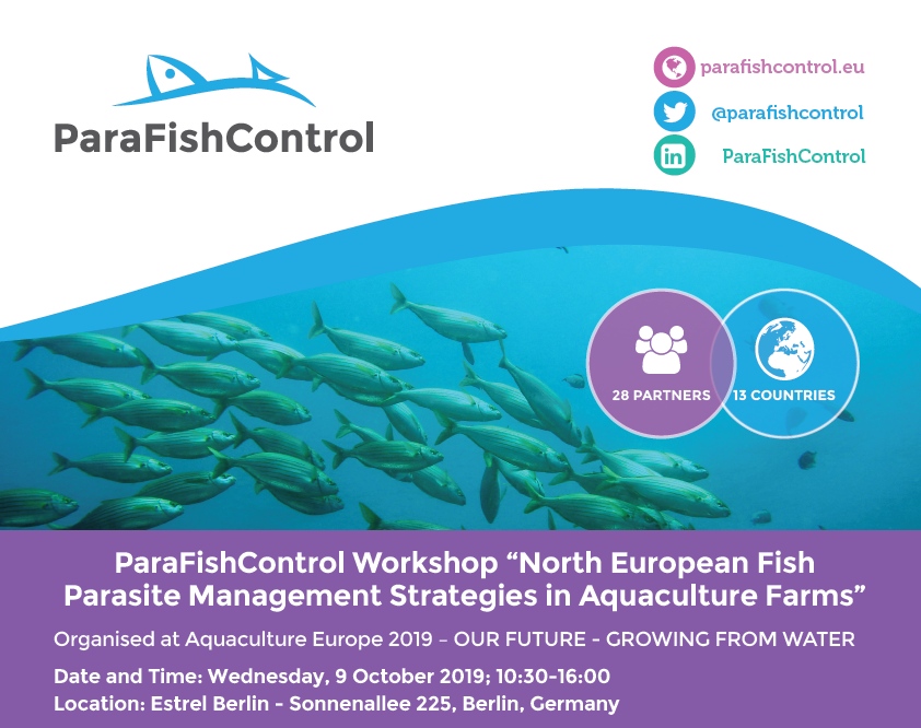 The “North European Fish Parasite Management Strategies in Aquaculture Farms” workshop will focus on the parasites which have been most damaging fresh and marine farmed species populations in North Europe (salmon, carp and trout) – Lepeophtheirus salmonis, Tetracapsuloides bryosalmonae, Sphaerospora molnari, Thelohanellus kitauei, Ichthyophthirius multifiliis, Paramoeba perurans, and Saprolegnia parasitica. During the workshop, industry representatives will provide an overview of the most prevalent issues related to parasitic diseases in North European aquaculture farms. ParaFishControl partners will then present the new tools and techniques developed within the project to diagnose, prevent and treat these diseases. The workshop will provide attendees with new knowledge to better manage their farms, and greatly reduce population loss in a cost-effective way.